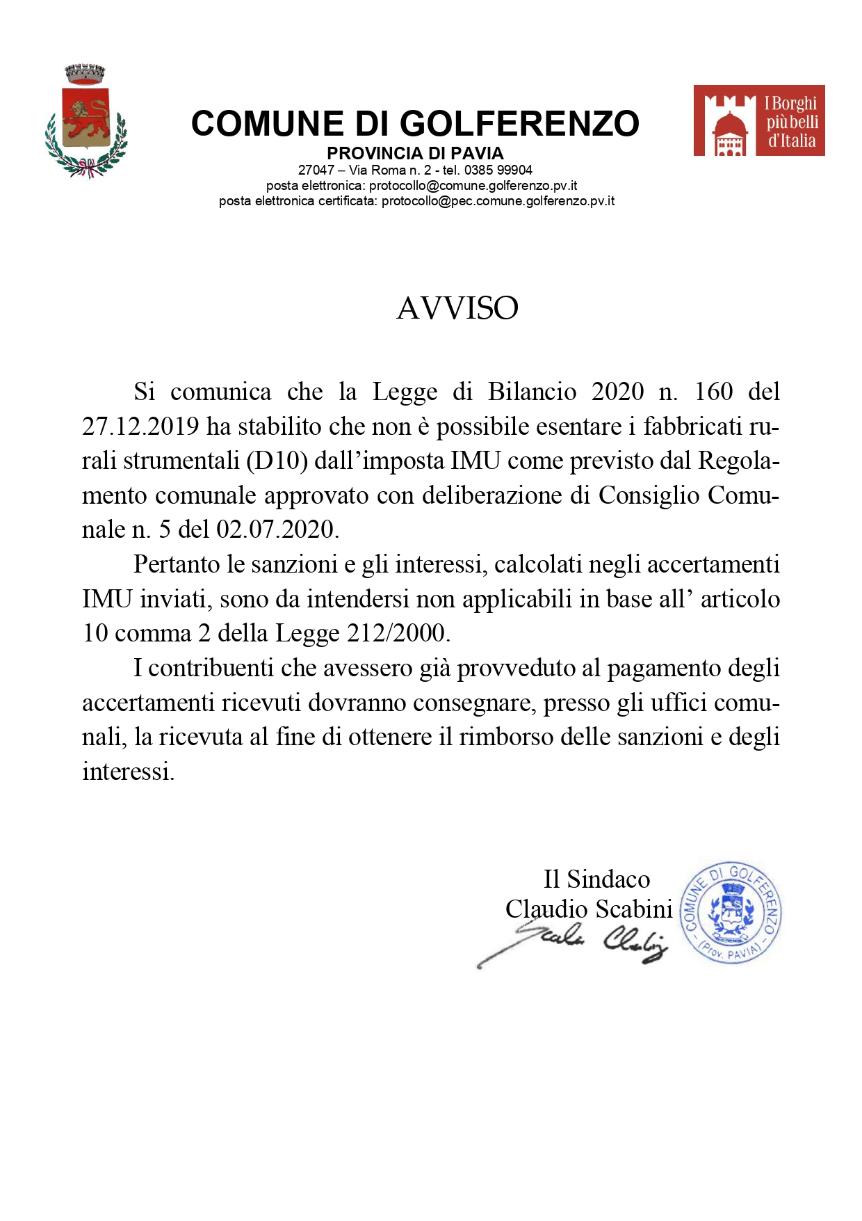 Avviso ai cittadini per accertamenti IMU su fabbricati rurali strumentali